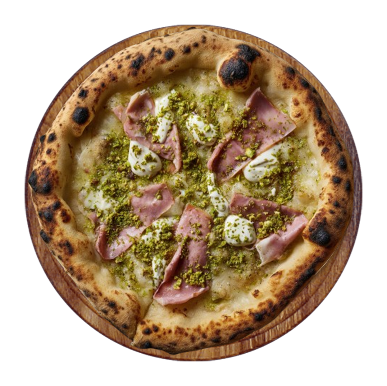 Crème fraîche, mozzarella fior di latte, mortadelle, pistache, stracciatella di burrata.