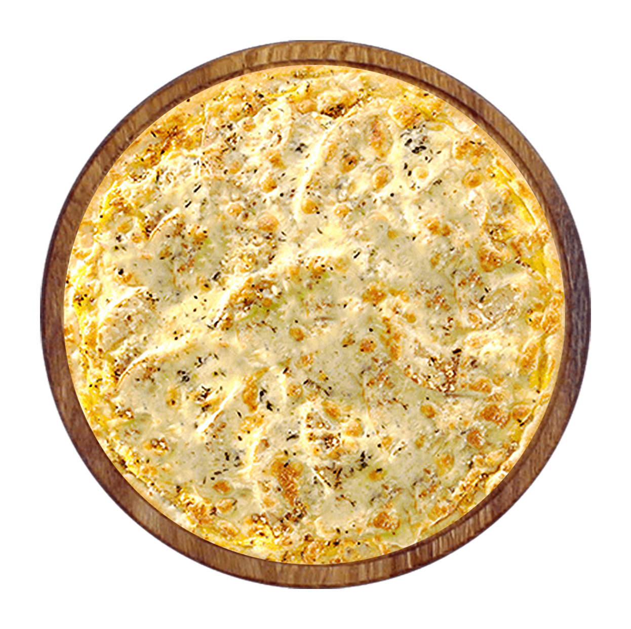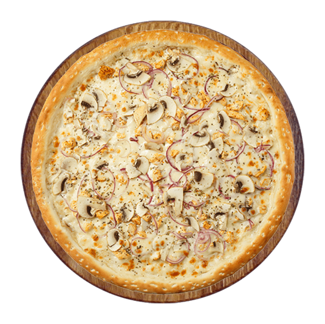 Crème fraîche, fromage, poulet, champignons, oignons, sauce fromagère.